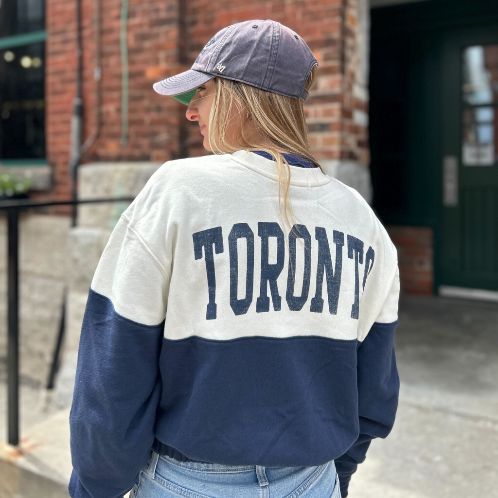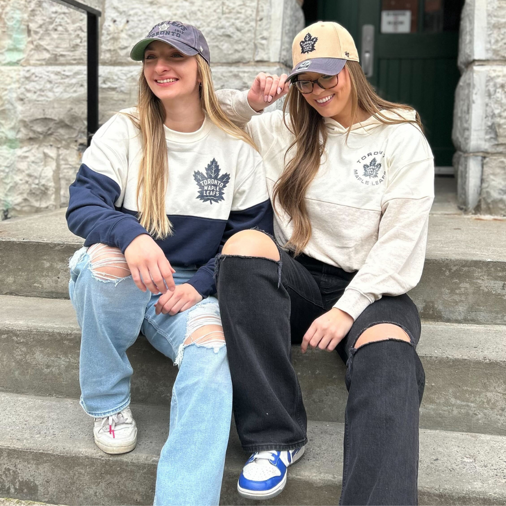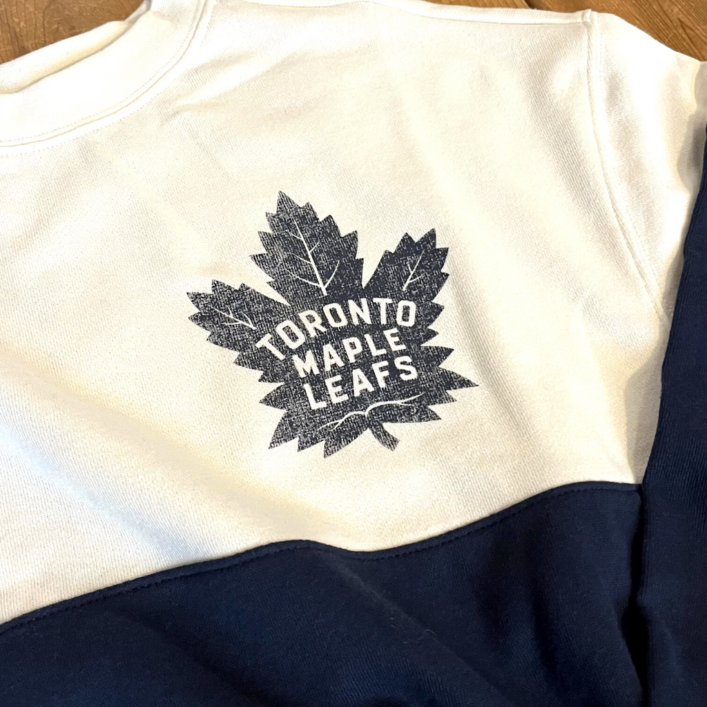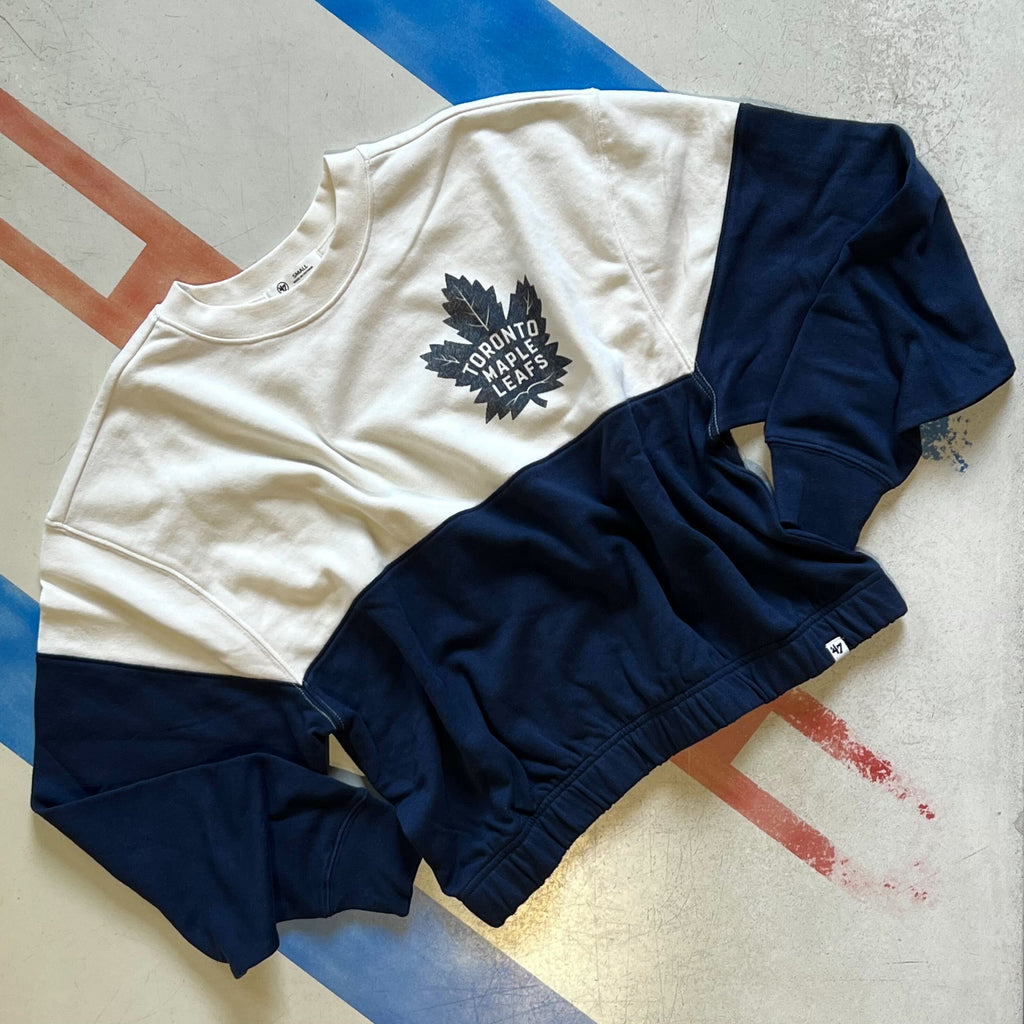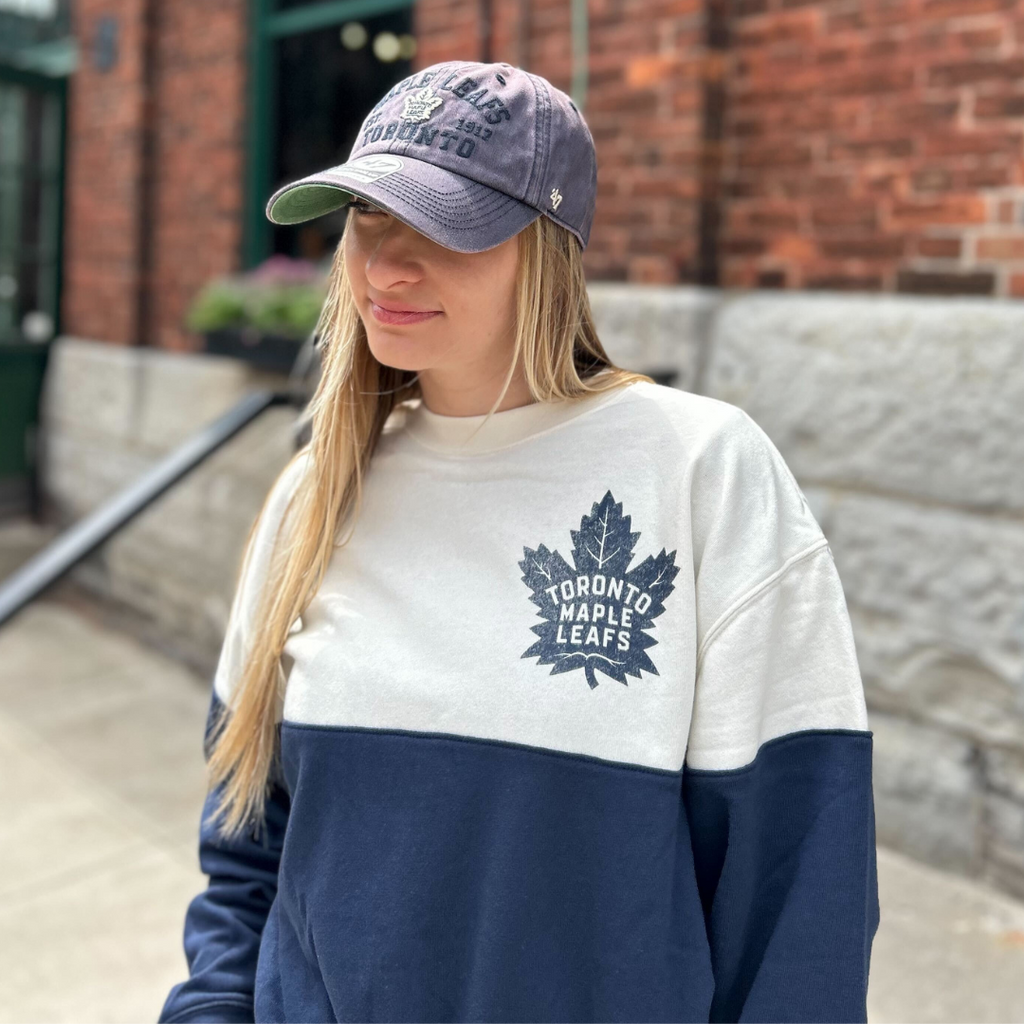 Support the home team in style with this Toronto Maple Leafs womens sweater. Featuring a contrasting ivory and navy style with Leafs logo on the front and team wordmark on the back. This style has a bit of a cropped hem, with elastic, making it great for higher-waisted bottoms.
