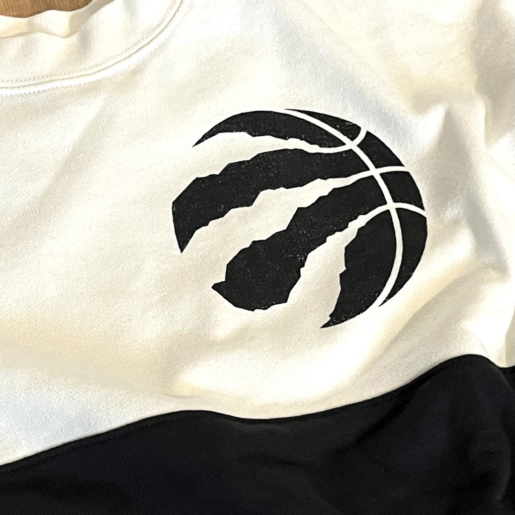 Support the home team in style with this Toronto Raptors womens sweater. Featuring a contrasting ivory and black style with Raptors logo on the front and team wordmark on the back. This style has a bit of a cropped hem, with elastic, making it great for higher-waisted bottoms.