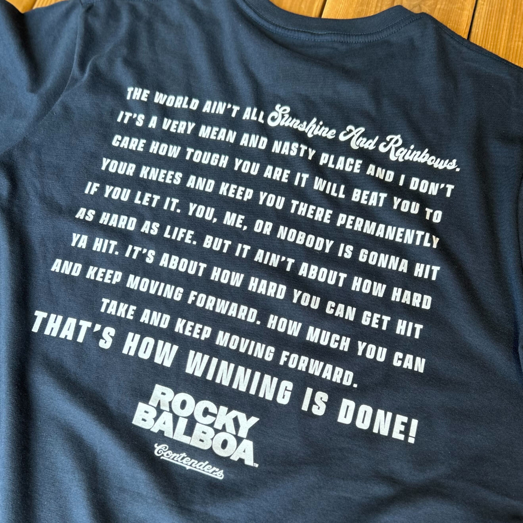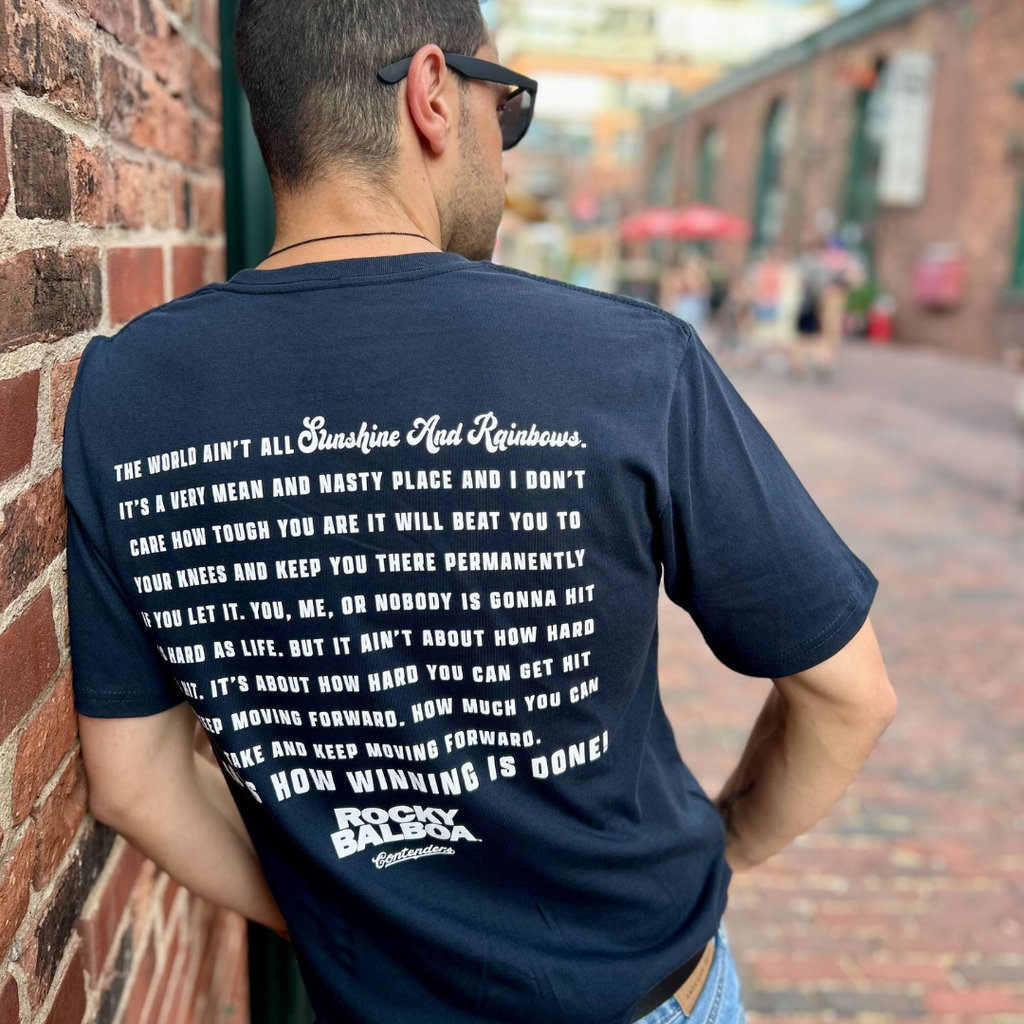 It's one of the greatest motivational speeches in film history: the iconic "Sunshine & Rainbows" monologue from Rocky Balboa. By popular demand, Contenders has put the entire goose bump-inducing speech on a limited release tribute heavyweight ring-spun cotton tee featuring a one-of-a-kind design, a set in collar and incredible durability.