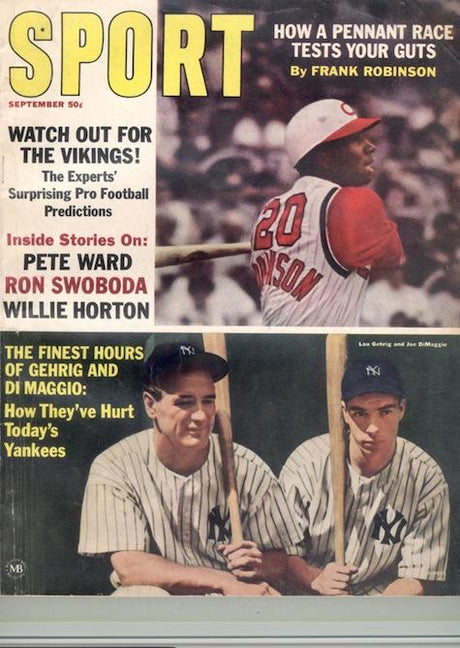 The September 1965 SPORT Cover features a trio of baseball legends; Frank Robinson of the Cincinnati Reds along with Joe DiMaggio and Lou Gehrig of the New York Yankees.