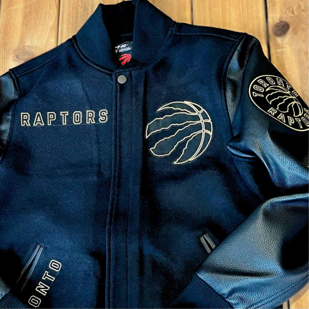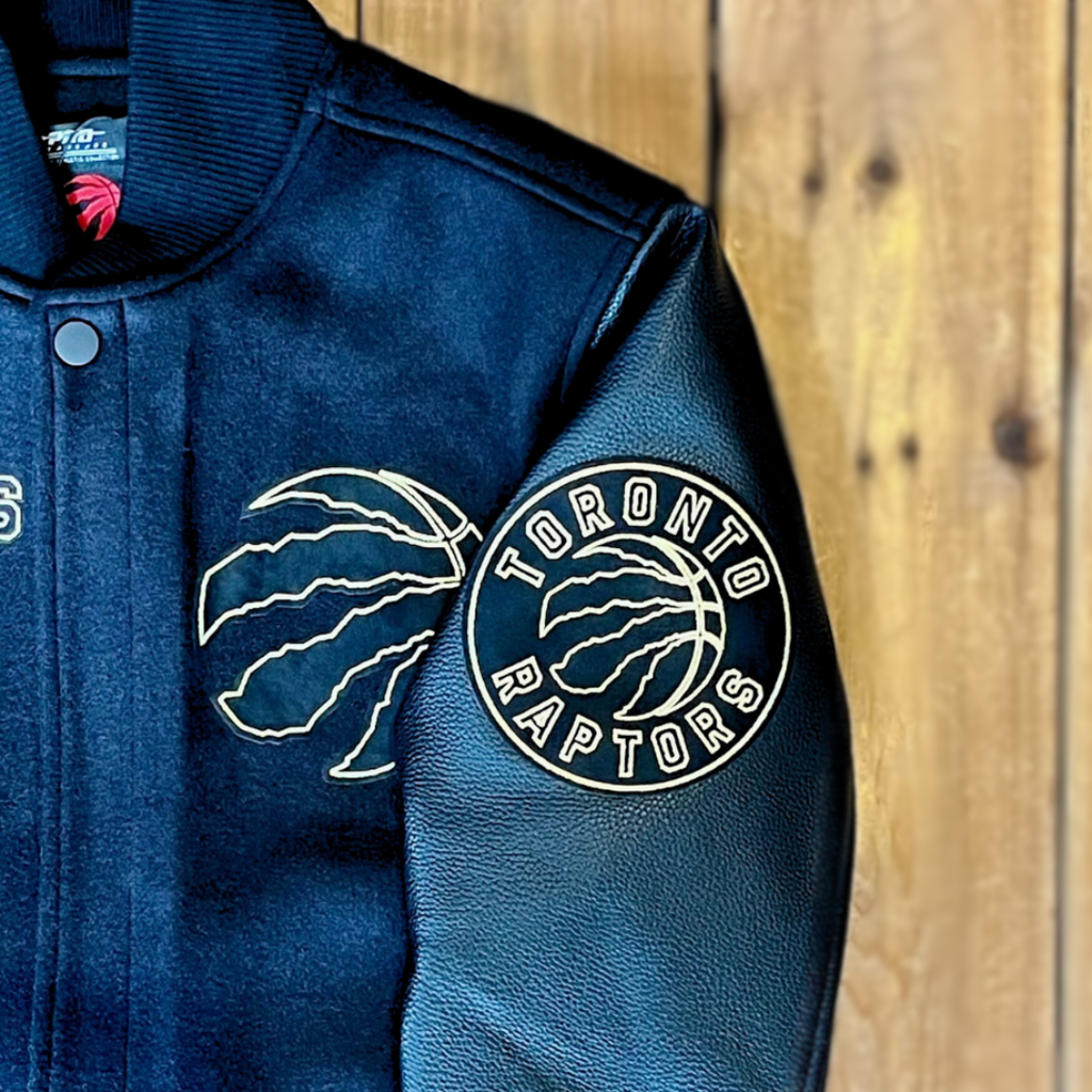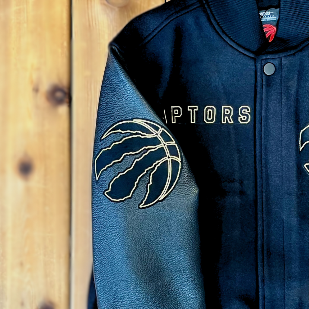 Support the Raptors in style in this seriously cool Black and Gold varsity jacket. Perfect for game night, date night, or any night.
