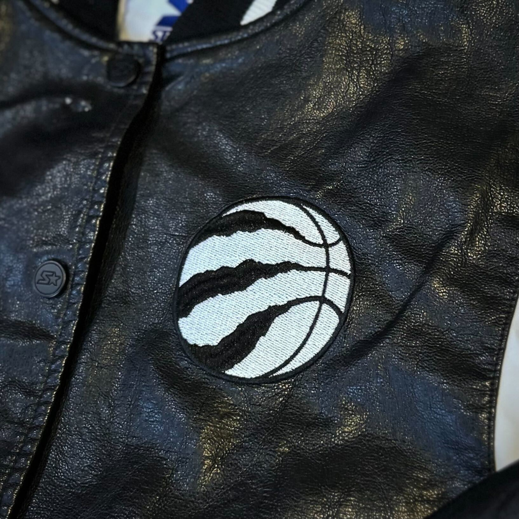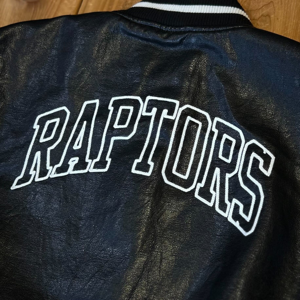 Rep the North in style. This black vegan leather jacket features a relaxed boyfriend fit with vintage white striped ribbing for a timeless varsity look. An applique Raptors logo accents the chest, with embroidered team lettering on the back.