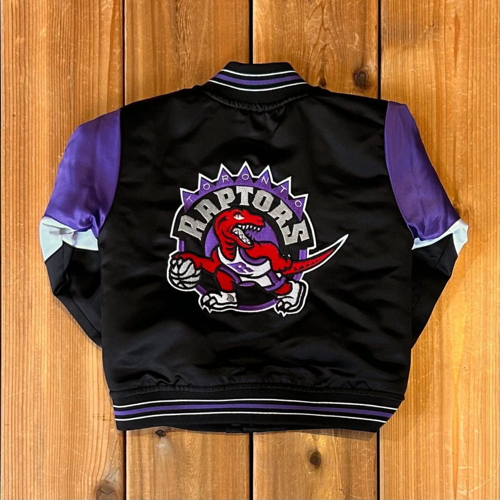 Throw it back with this bold black satin Toronto Raptors jacket, sized for fans of the next generation. Featuring the iconic 1995 Raptors wordmark across the chest, complemented by purple and white sleeve panels, this jacket makes a statement on and off the court. A large retro Raptors logo dominates the back for that ultimate throwback look.