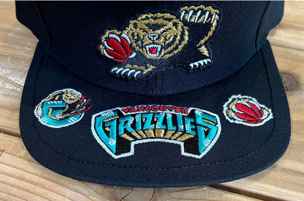 This Vancouver Grizzlies Mitchell & Ness snapback makes a statement with a front loaded brim—the hats boasts 5 embroidered Grizzlies logos.