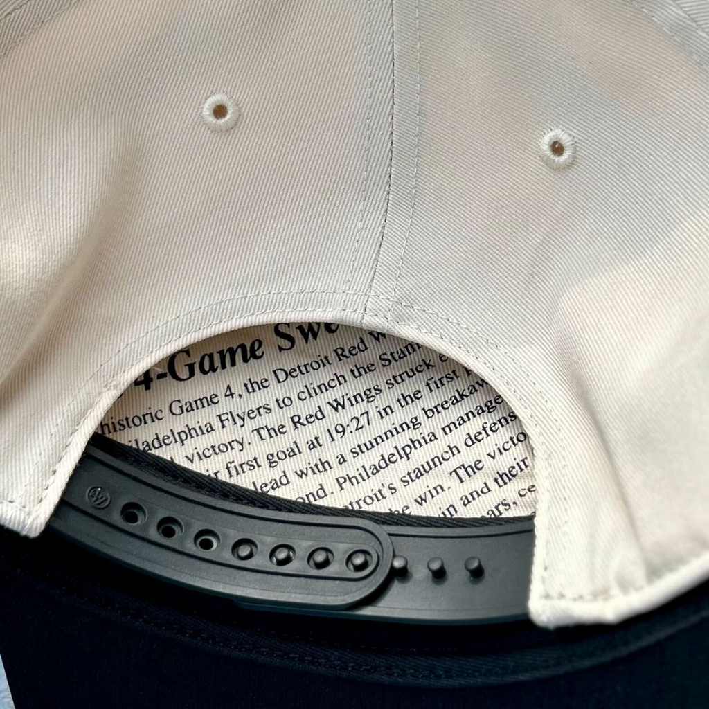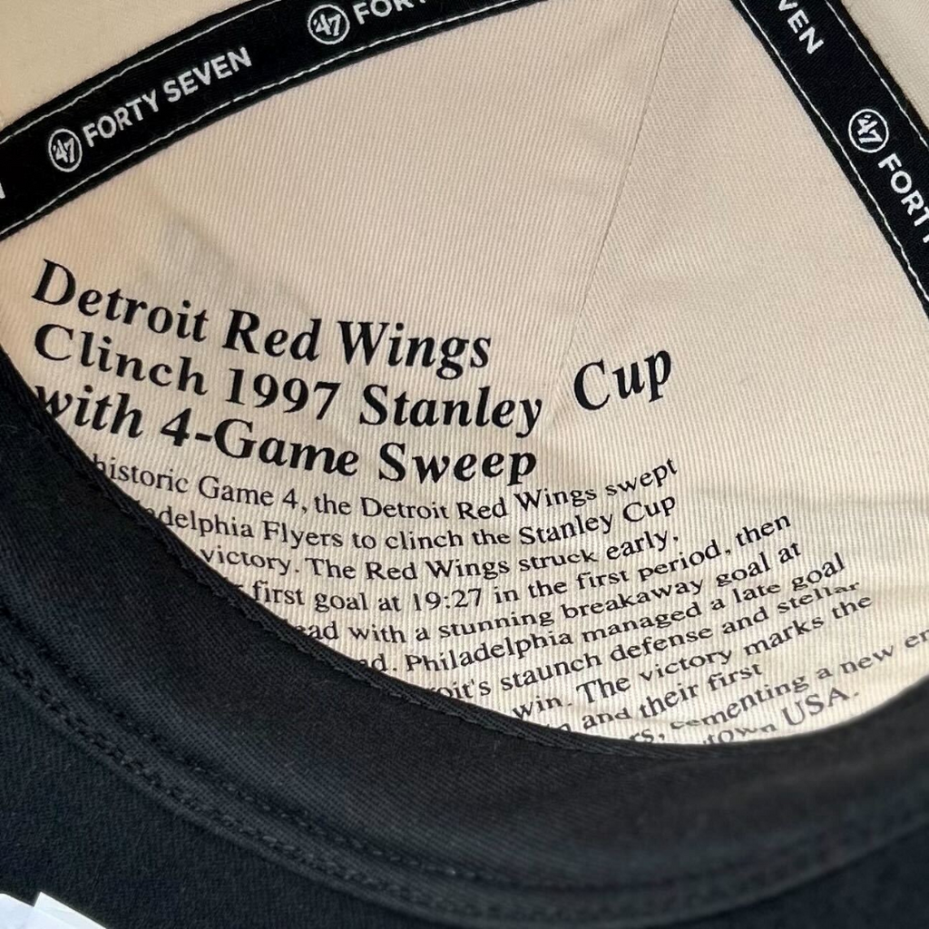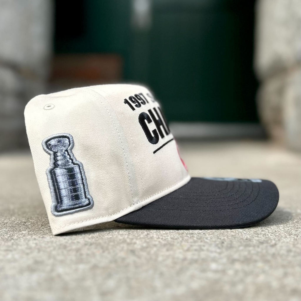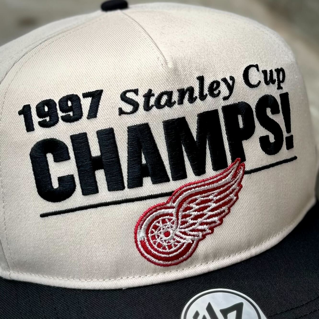Commemorate the 1997 Stanley Cup Champions, the Detroit Red Wings! The Tabloid ’47 HITCH RF is a relaxed-fit two-tone snapback crafted from unwashed cotton twill with embroidered championship graphics on the front, a vintage Stanley Cup logo side hit, and simulated front-page headlines hidden underneath the crown.