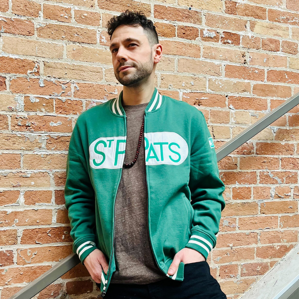 - Green colour with vintage embroidered appliqué St. Pats logo on the front