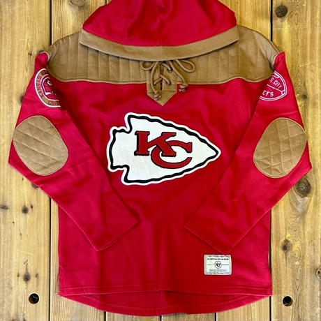 Show your team pride with vintage flair in the '47 Kansas City Chiefs NFL Golden Age Wingback Lacer Hoodie. This hockey-inspired silhouette blends classic sports style with cozy comfort, featuring midweight fleece and a thermal-lined hood to keep you warm through every quarter. The bold twill appliqué Chiefs graphics on the body, shoulders, and sleeves make it clear who you're backing—whether you're tailgating, watching from home, or braving the stadium.