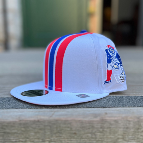 The New England Patriots Historic Helmet Pack 9FIFTY Snapback features an embroidered fabric applique Patriots replica helmet design at the crown with a matching woven team logo tag at an adjustable snapback closure at the rear and a red undervisor.