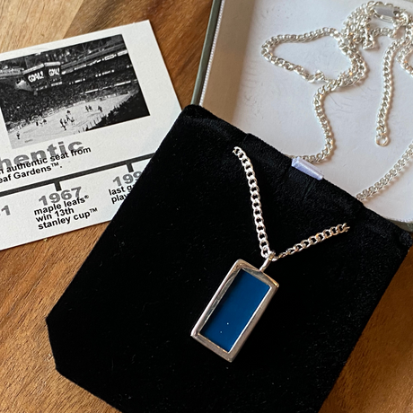 The perfect gift for the true Leafs fan! This pendant is made with a piece from an authentic Maple Leafs Gardens chair (blue).