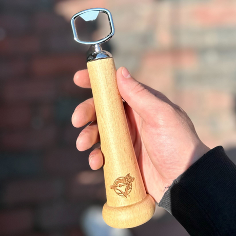 Be a winner at every party with this Toronto Blue Jays MLB Baseball Knob Bottle Opener! The retro logo bat end design adds a touch of nostalgia to this quirky bottle opener, making the perfect tool for any Jays fan. Crack open a cold one in style with this unique and playful accessory.