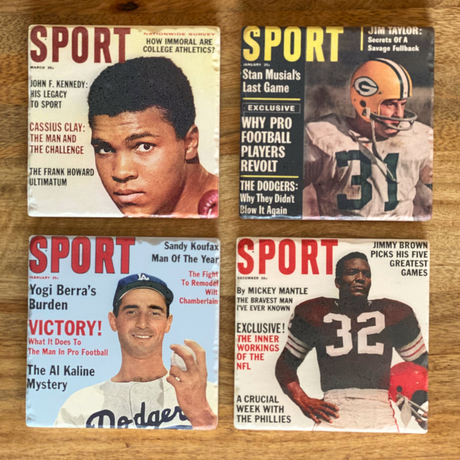 - 4 coasters in a set, each with a unique vintage SPORT magazine cover