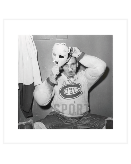 This Open Edition Print (OEP) features legendary goalie Jacques Plante. A six-time Stanley Cup champion and seven-time Vezina Trophy winner (for top goaltender), Plante is best known for his years with the Montreal Canadiens, though he also played for the Rangers, Maple Leafs, Blues, and Bruins in the NHL. He's also known for being the first goalie to use a mask in-game, in 1959. His coach at the time, Toe Blake, didn't approve of this protective wear as he thought it would limit the goalie's vision. But, after Plante won 18-straight games with it on, the mask would stay for good.