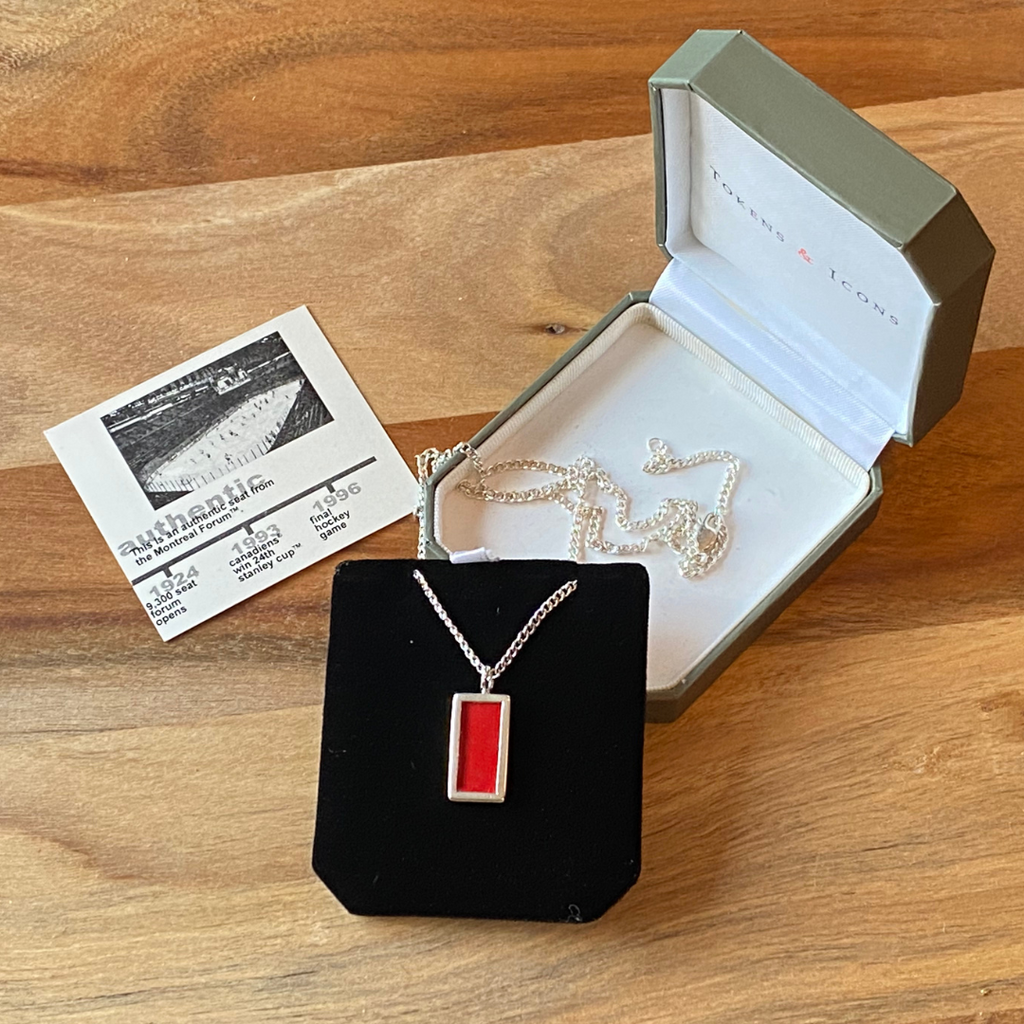 The perfect gift for the true Habs fan! This pendant is made with a piece from an authentic Montreal Forum seat (red).