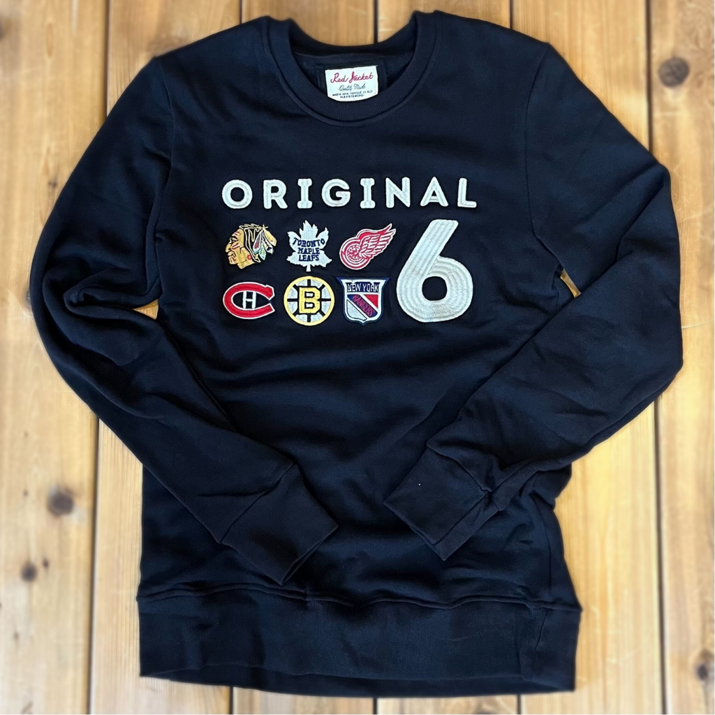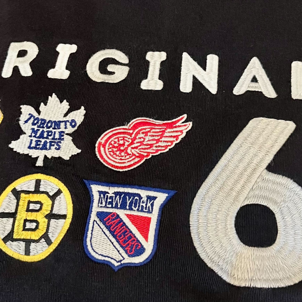 Keep cozy in style in this Original Six Fleece crewneck sweater. The Original Six NHL era began with the demise of the Brooklyn Americans in 1942 and lasted until the 1967 NHL expansion. For those 25 years, only 6 teams played in the NHL: the Toronto Maple Leafs, Montreal Canadiens, Boston Bruins, Detroit Red Wings, Chicago Blackhawks, and Detroit Red Wings. This beatiful, fully-embroidered, super soft long-sleeve tee features all the Original 6 team logos.