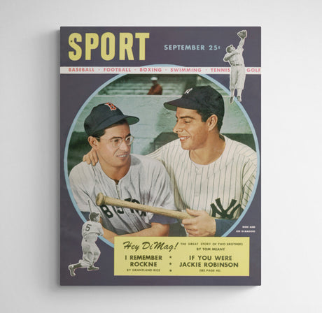 Playing for rivals the Yankees and Red Sox, brothers Joe and Dom DiMaggio are featured on the cover of the September 1947 issue of the SPORT Magazine. While everyone knows about Joe's greatness, younger brother Dom was no slouch either. He was a dynamite leadoff hitter, stolen bases machine and defensive standout in being named a 7-time All-star during his 11-year career with the Red Sox.