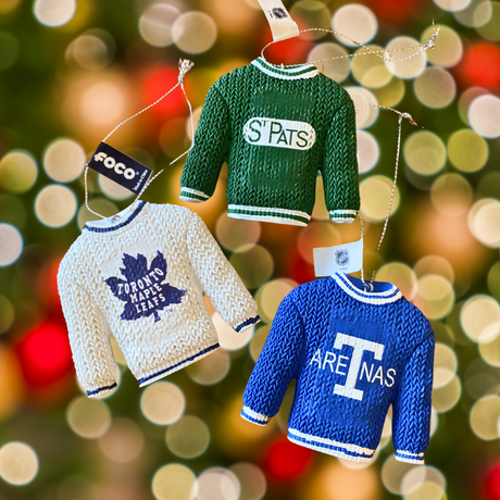 Add a little hockey history to your tree with this set of 3 Toronto Maple Leafs franchise sweater ornaments! Features a Toronto Arenas, Toronto St. Pats, and Toronto Maple Leafs sweater.