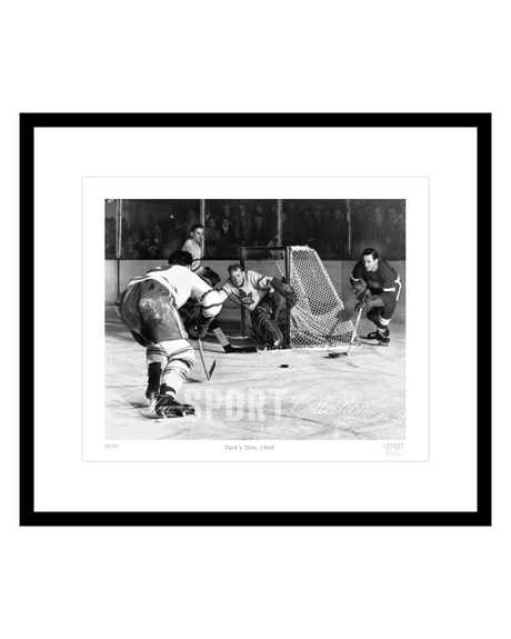 Peerless in the playoffs, Walter “Turk” Broda led the Maple Leafs to four Stanley Cups in five seasons, finishing with a post-season 1.98 goals against average. In this classic shot by legendary photographer Harold Barkley, Broda looks warily on as Detroit’s Red Kelly rounds the net, with Leafs defencemen Jim Thomson and Gus Mortson ready to help out.