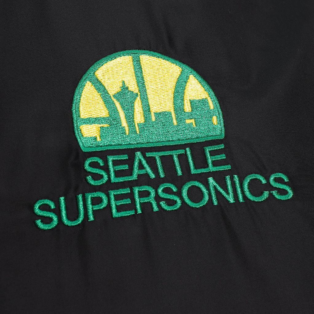 The perfect gift for the classic basketball fan! This womens puffer coat features the retro Supersonics logo embroidered on the front, with the team wordmark on the back, all on a classic red letterman style puffer.
