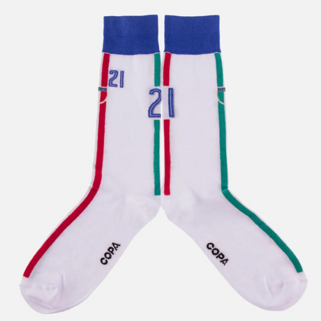 Relive iconic football history moments through COPA's curated sock collection. These are a collection of socks produced in Italy using the highest quality materials and traditional craftsmanship. The socks are individually constructed on a 200 needle knitting machine using soft combined cotton yarns for ultimate comfort.