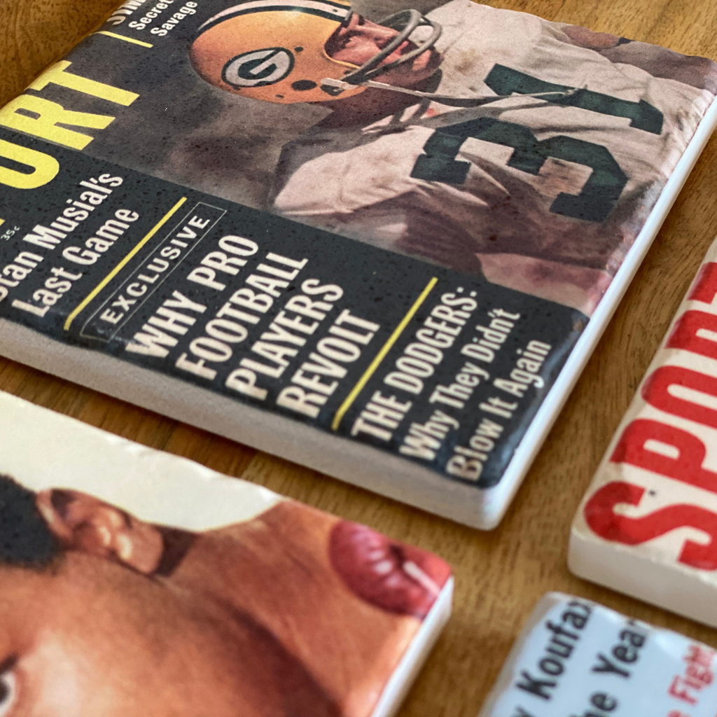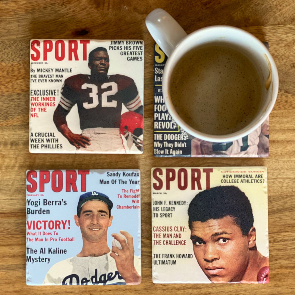 - 4 coasters in a set, each with a unique vintage SPORT magazine cover