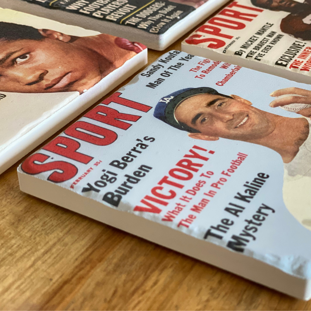 Before there was Sports Illustrated there was SPORT magazine—the first general-interests monthly sports magazine, launched in 1946 and best remembered for its exquisite color photography and classic prose. Step back in time with this unique set of vintage SPORT magazine cover coasters. Each set comes with 4 different vintage covers from the 1950s—each commemorating a unique time in sport history. These coasters are the perfect gift for any classic sport fan! Say goodbye to those water rings on your table!