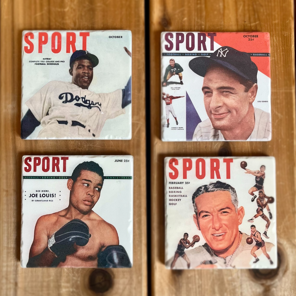 - 4 coasters in a set, each with a unique vintage SPORT magazine cover