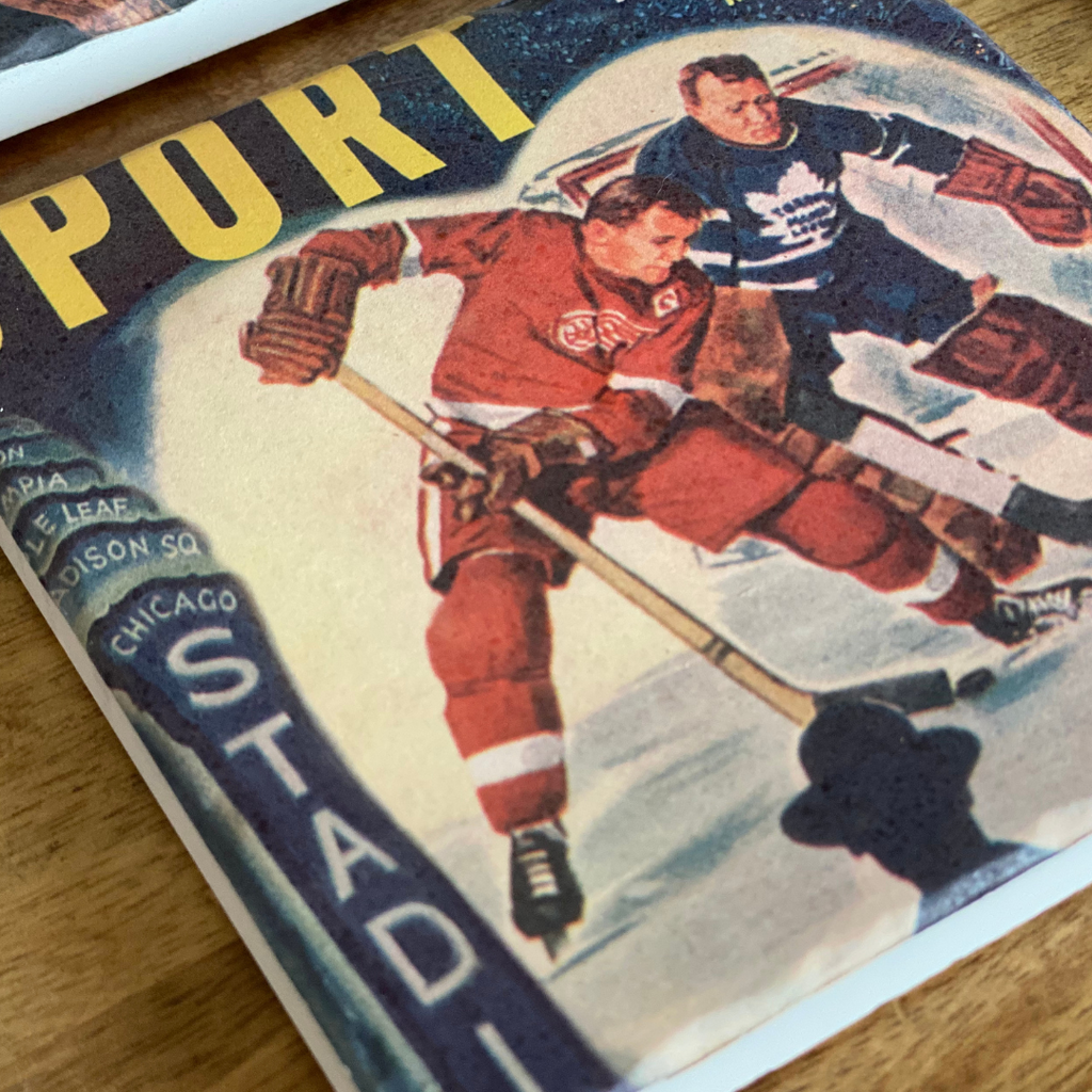 Before there was Sports Illustrated there was SPORT magazine—the first general-interests monthly sports magazine, launched in 1946 and best remembered for its exquisite color photography and classic prose. Step back in time with this unique set of vintage SPORT magazine cover coasters. Each set comes with 4 different vintage hockey covers, covering each of the original six hockey teams. These coasters are the perfect gift for any classic sport fan! Say goodbye to those water rings on your table!