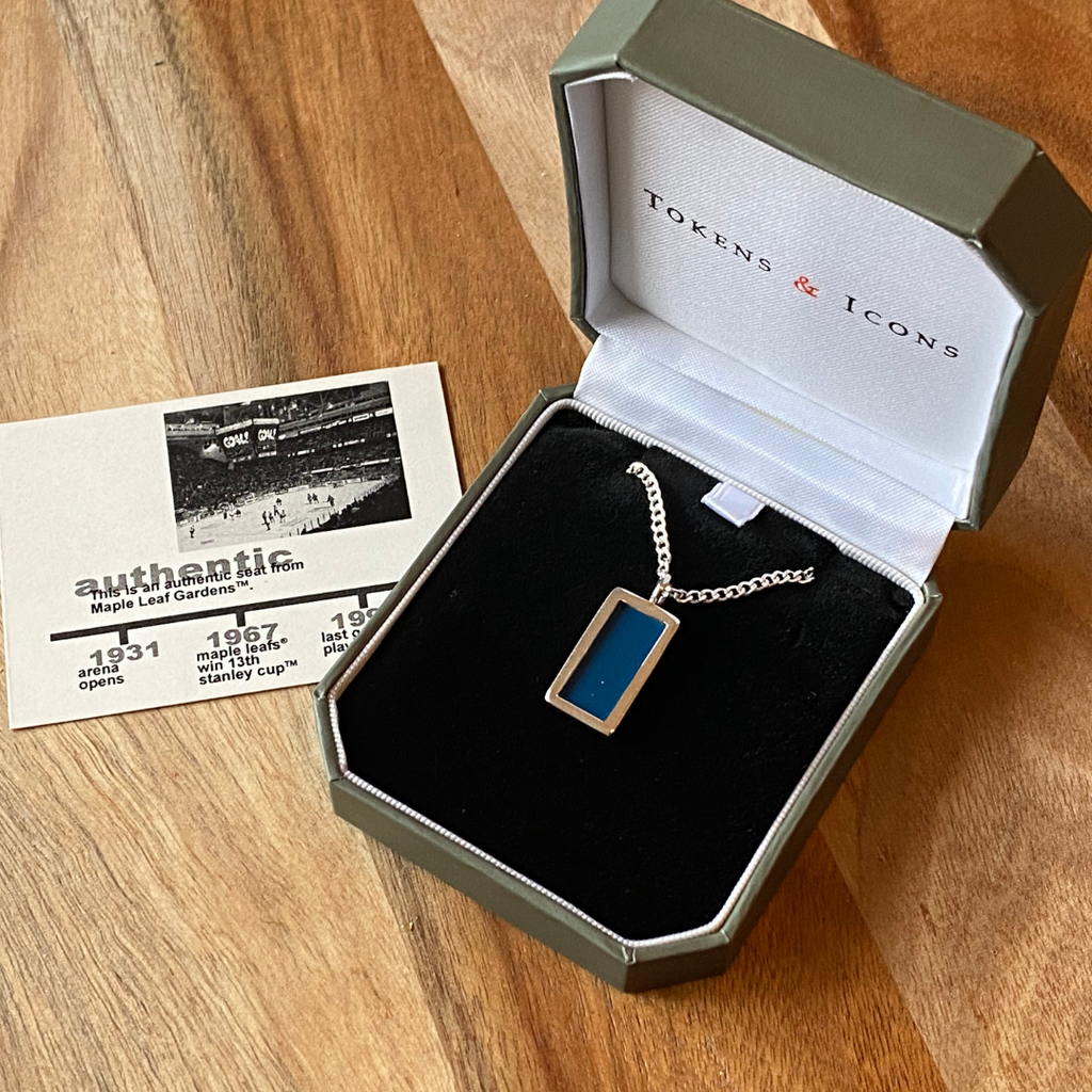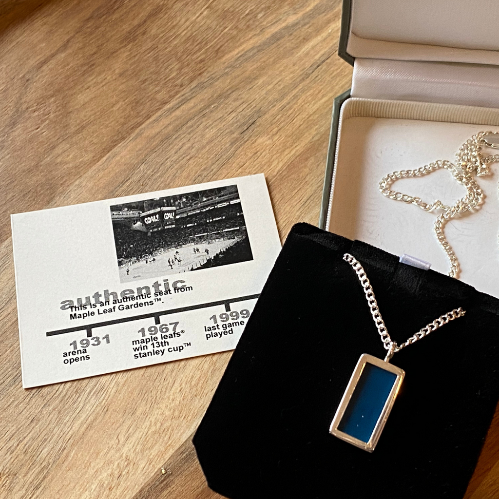 The perfect gift for the true Leafs fan! This pendant is made with a piece from an authentic Maple Leafs Gardens chair (blue).