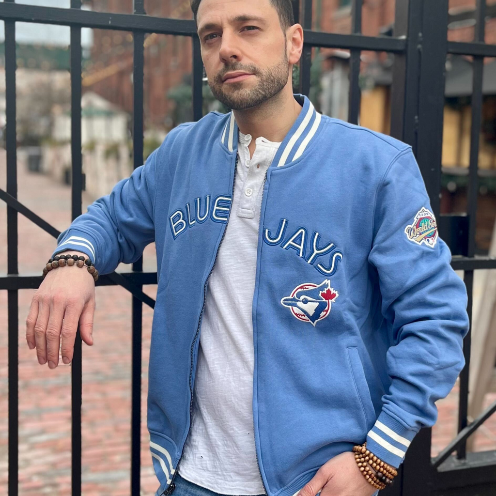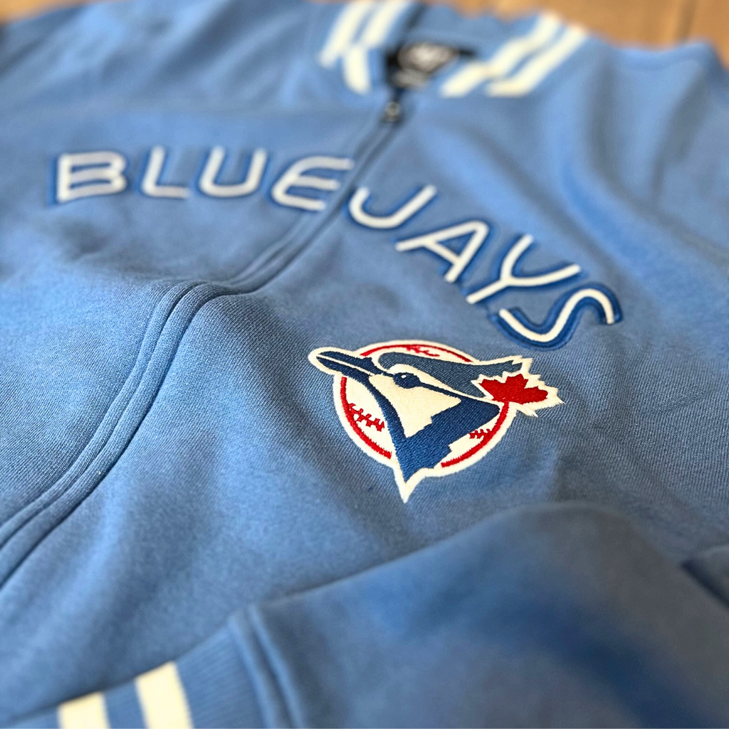 Root, root, root for the home team in this awesome vintage-inspired Toronto Blue Jays track jacket, featuring the 1992 World Series Patch and Blue Jays front jersey wordmark with logo.