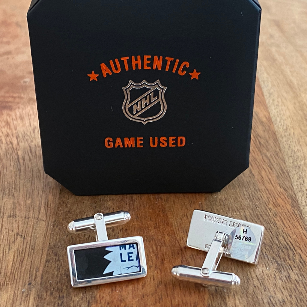 The perfect gift for the Leafs fan that has everything! Wear your Leafs pride on your sleeve with these unique cufflinks made from an authentic game-used Toronto Maple Leafs NHL puck. Featuring scratches and scuffs of game-played pucks.