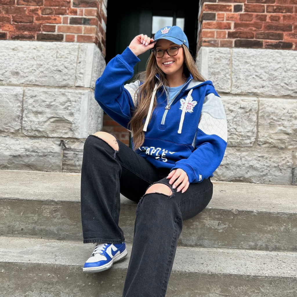 Show your Leafs pride is this awesome hoodie--inspired by Starter's classic pullover jacket. This hoodie has it—half zipper, hood, kangaroo pocket, cut and sew panels. It features the rarest Leafs logo: the red font logo from 1947, which was used only for promotional photos, and represented Canadian patriotism.