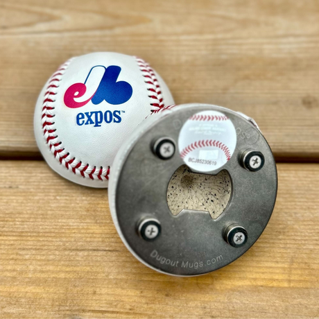 "The Cutter" by Dugout Mugs® is a real baseball cut in half to create the ultimate bottle opener for baseball fans! Featuring the logo of your favorite throwback baseball team—the Montreal Expos! The magnet on the back also catches the cap of your bottle so it doesn't go flying onto the floor!