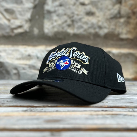 The Toronto Blue Jays 2025 League Championship Series 9FORTY Curved Adjustable Cap features an embroidered Blue Jays logo and World Series graphic at the front. Same logo as the Toronto Blue Jays 2025 League Championship Series Locker Room Split Panel Cap, just in a structured curved adjustable hat style.