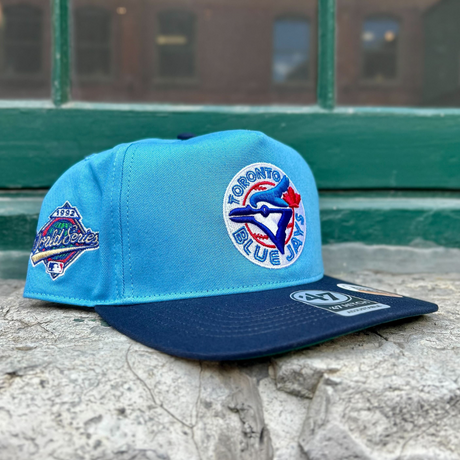 The evolution of our fan favourite Blue Jays Two Tone Hitch Hat by ‘47 Brand. This version features the franchise’s original logo paired with the addition of their 1992 World Series logo as a side patch, both embroidered on a powder blue crown matched with a navy brim, button and strap. This exclusive cap won’t be around for long. Grab yours now!