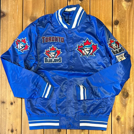 Step up your game-day look with this Toronto Blue Jays retro satin jacket that channels vintage team pride with modern craftsmanship. This piece features bold embroidered patches showcasing throwbacks Blue Jays logos and lettering from the 1997 era. The smooth satin finish delivers a sleek, throwback vibe, while striped rib-knit cuffs, collar, and hem complete the retro athletic look.