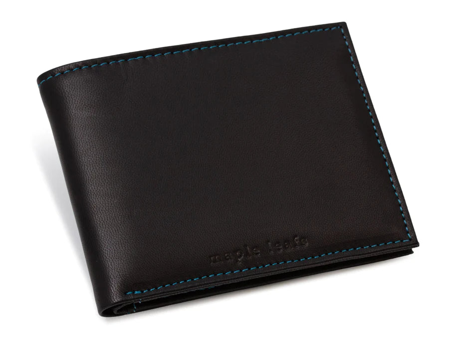 - Wallet is top quality black goat leather and measures 4-1/4" x 3-3/8" when closed. Mesh ID pocket and five card slots inside. The team name also is debossed on the front.