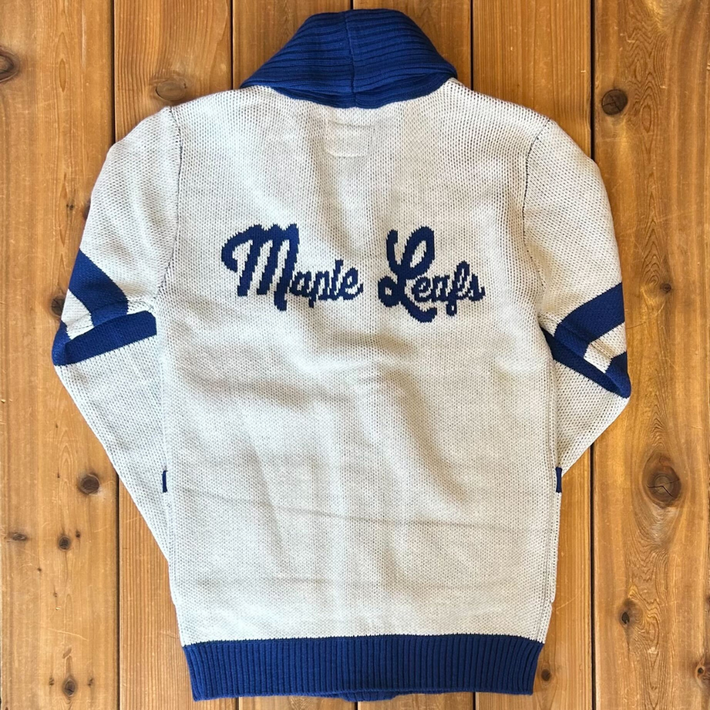 Inspired by the Toronto Maple Leafs cardigans worn by Leafs of the past, this amazing hockey cardigan features a shawl collar, pockets, buttons, with an embroidered logo not he chest and the "Maple Leafs" team name knit into the back.