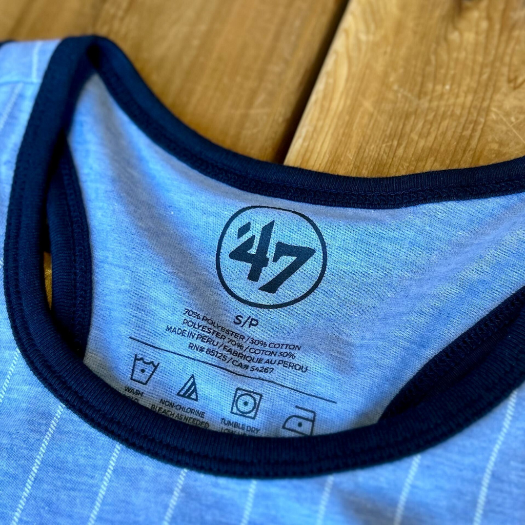 - Navy ribbed fabric cording along neck & shoulders with printed Navy text & Brooklyn Dodgers logo.