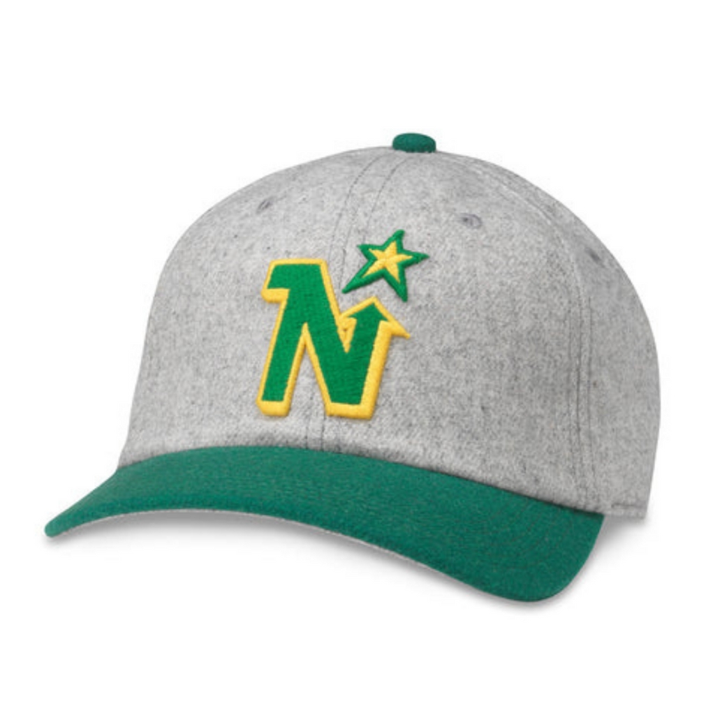 The greatest vintage hockey hat for an iconic defunct team, the Minnesota North Stars. Our new favourite hat features a truly vintage look with a wool fabric and embroidered logo. It has a slightly higher crown than a dad hat, and features an adjustable wool strap.