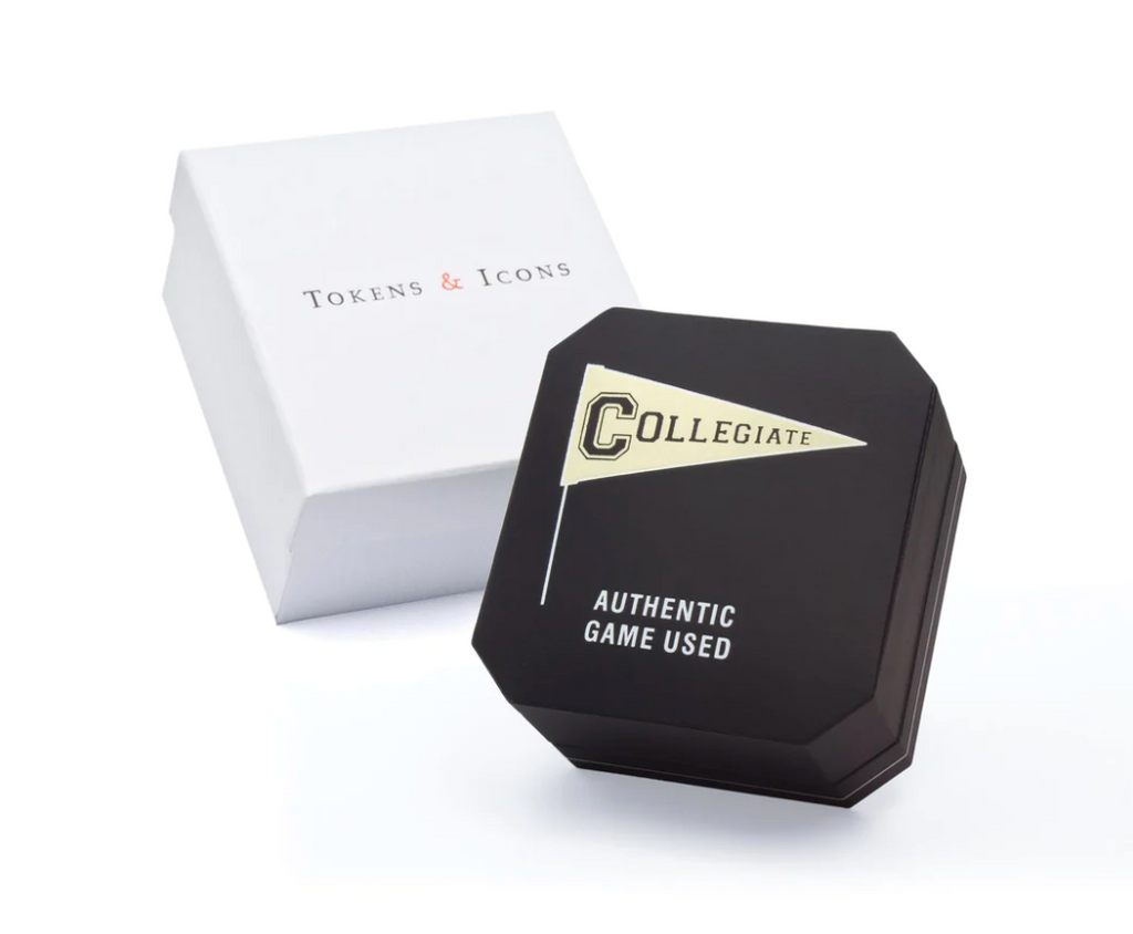 Prior to 2011, Notre Dame student managers would spray paint the helmets prior to each game with, legend has it, paint infused with gold flakes from the iconic campus dome. Tokens & Icons works exclusively with these older helmets, setting them in sterling to commemorate one of the great collegiate traditions.