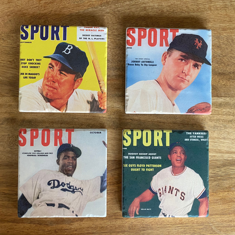 Before there was Sports Illustrated there was SPORT magazine—the first general-interests monthly sports magazine, launched in 1946 and best remembered for its exquisite color photography and classic prose. Step back in time with this unique set of vintage SPORT magazine cover coasters. Each set comes with 4 different vintage cover featuring the Giants or the Dodgers in their original New York state home. These coasters are the perfect gift for any classic sport fan! Say goodbye to those water rings on your table!