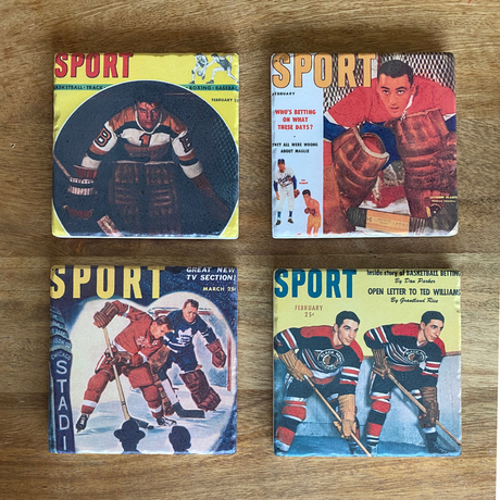 Before there was Sports Illustrated there was SPORT magazine—the first general-interests monthly sports magazine, launched in 1946 and best remembered for its exquisite color photography and classic prose. Step back in time with this unique set of vintage SPORT magazine cover coasters. Each set comes with 4 different vintage hockey covers, covering each of the original six hockey teams. These coasters are the perfect gift for any classic sport fan! Say goodbye to those water rings on your table!