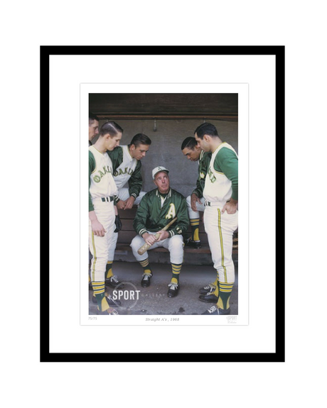 In this classic image created exclusively for an August 1968 SPORT magazine feature titled, “Why the Young Players Love Joe DiMaggio,” the former Yankee great is reveling in his role as a coach with the Oakland A’s. Here he mentors (standing) John Donaldson, Reggie Jackson, Rick Monday and (seated) Sal Bando and Joe Rudi. The hand-printed image was created from the original transparency.