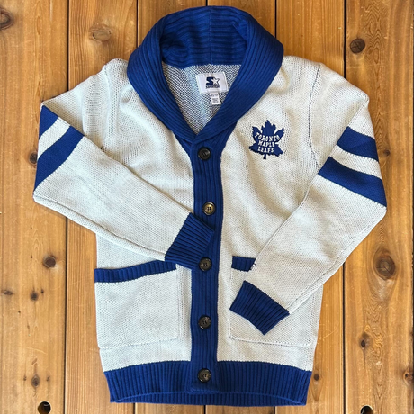 Inspired by the Toronto Maple Leafs cardigans worn by Leafs of the past, this amazing hockey cardigan features a shawl collar, pockets, buttons, with an embroidered logo not he chest and the "Maple Leafs" team name knit into the back.